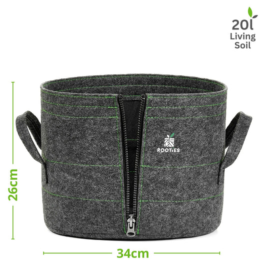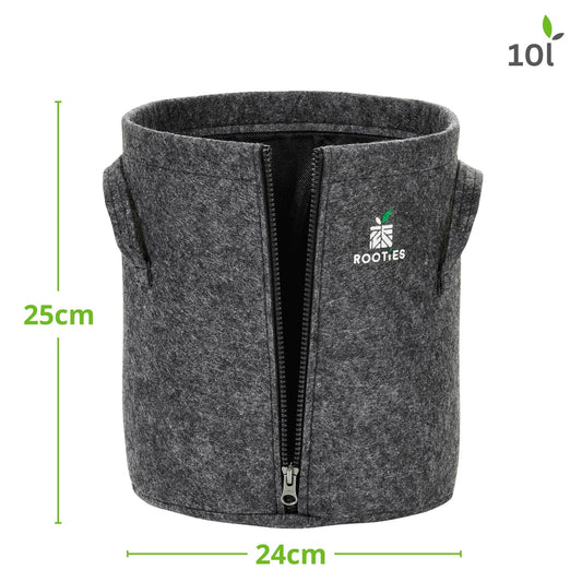 Reißverschluss-Töpfe sind primär für den Innenbereich gedacht, können aber auch draußen verwendet werden. Ihr Innenlayer ist etwas dünner, was die Verdunstung von überschüssigem Wasser verbessert. Dadurch trocknet die Erde im Freien jedoch schneller aus, sodass die Pflanzen häufiger gegossen werden müssen. Außerdem kann der Reißverschluss durch hohe UV-Einstrahlung nach einigen Jahren brüchig werden. Ein Vorteil der Reißverschluss-Töpfe ist jedoch die bessere Kontrolle des Wurzelballens, da sich der Verschluss besonders einfach wieder schließen lässt.